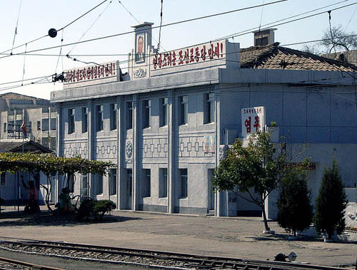 ¿°ÁÖ¿ª °Ç¹°ÀÇ Á¤¸é Áß°£¿¡ ÇÑ ÆøÀÇ ±èÀϼºÃÊ»óÀÌ °É·ÁÀÖ¾ú°í, ¾ç¸é¿¡ ±¸È£°¡ ÀÖ¾ú´Ù. ¿À¸¥ÂÊ¿¡´Â ¡°À§´ëÇÑ ¼ö·É ±èÀϼºµ¿Áö ¸¸¼¼¡±, ¿ÞÂÊ¿¡´Â ¡°À§´ëÇÑ Á¶¼±³ëµ¿´ç ¸¸¼¼¡±¶ó°í ¾º¾îÁ® ÀÖ¾ú´Ù. ºÏÇÑÀÇ ¿ªÀü¸¶´Ù ¾îµð¶ó ÇÒ °Í ¾øÀÌ ÀÌ¿Í °°Àº °Ý½ÄÀ» °®Ãß°í ÀÖ¾ú´Ù.