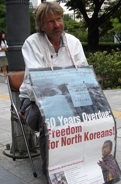±×´Â ¡®Freedom for North Koreans'(ºÏÇÑÁֹο¡°Ô ÀÚÀ¯¸¦)¡¯¶ó´Â ÇÇÄÏÀ» ¸Å°í ½ÃÀ§ÁßÀÌ´Ù. ´Ü½ÄÀ¸·Î ü·ÂÀÌ ±Þ°ÝÈ÷ ¾àȵŠÀÇÀÚ¿¡ ¾É¾Æ ½ÃÀ§¸¦ ÁøÇàÇϰí ÀÖ´Ù. ±×´Â ÇÏ·ç Á¾ÀÏ 1ÀÎ ½ÃÀ§¸¦ Çϰí ÀÖÀ¸¸ç Àáµµ ¿Ü±³Åë»óºÎ ÀÔ±¸ ¿· ±¸¼®°ú ÁÖº¯ °ø¿ø¿¡¼ µ¾ÀÚ¸® Çϳª¸¸ ±ò°í ÀÚ°í ÀÖ´Ù. À帶ºñ¿¡µµ ÀÚ¸®¸¦ À̵¿ÇÏÁö ¾Ê¾Ò´Ù.