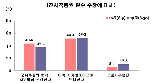 ÀÛÅë±Ç ȯ¼ö¿¡ ´ëÇØ ½Ã±â»óÁ¶·Î ¹Ý´ëÇÑ´Ù´Â ÀǰßÀÌ 52.3%ÀÎ ¹Ý¸é, ±º»çÁÖ±ÇÀÇ È¸º¹ Â÷¿ø¿¡¼ Âù¼ºÇÑ´Ù´Â ÀǰßÀº 37.4%¿¡ ±×ÃÆ´Ù. 16Â÷ Á¶»ç(9ÀÏ) °á°ú¿Í ºñ±³ÇÏ¸é ¹Ý´ëÀǰßÀº 1.2%Æ÷ÀÎÆ® ³ô¾ÆÁ³°í, Âù¼º ÀǰßÀº 6%Æ÷ÀÎÆ® Ç϶ôÇß´Ù.